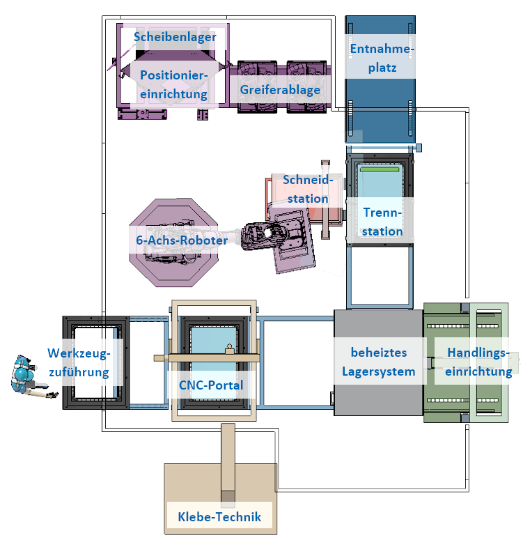 Im Projektlauf konnte die Entwicklung einer wiederverschließbaren Isolierglasscheibe erfolgreich umgesetzt werden. In diesem Zusammenhang wurde das Produkt aufgebaut. Die entwickelte Fertigungstechnologie wurde in einer Testumgebung teilautomatisiert realisiert, womit die konturgenaue und verschleißfeste Dichtung hergestellt werden konnte. Dazu wurden die notwendigen Prozessparameter und Besonderheiten ermittelt. Ein Bestandteil war die Entwicklung eines geeigneten Werkzeuges zur Dichtungsherstellung, wobei das Schablonenmaterial und dessen Beschichtung eine entscheidende Rolle einnehmen. Außerdem erfolgte die Entwicklung und der Aufbau eines beheizbaren Lagersystems, um die Trocknungsprozesse zu beschleunigen. Auf Basis der Erkenntnisse aus der Versuchsumgebung ist ein Automatisierungskonzept entstanden, welches die Serienfertigung dieses Produkttyps in verschiedenen Größen ermöglicht. Dabei werden spezielle Werkstückträger über Fördertechnik durch die Automationszelle an den erforderlichen Stationen (Klebestation, Trocknungsstation) vorbeigeführt. Ein 6-Achs-Roboter realisiert das Handling der Glasscheiben.