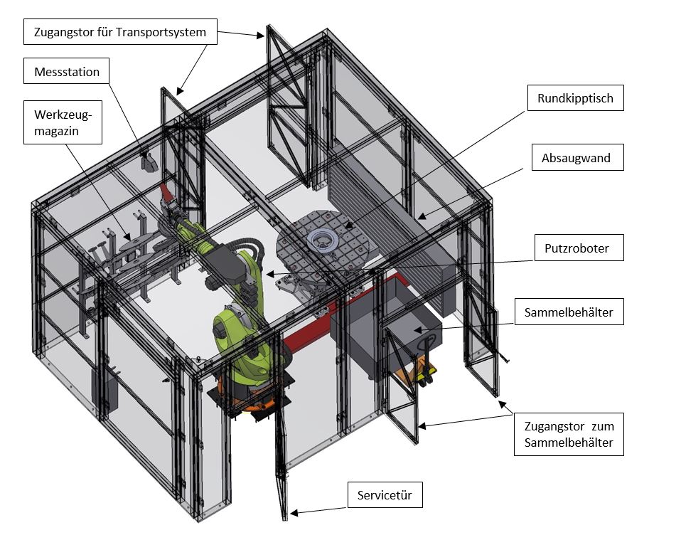 Neben der entwickelten Bearbeitungstechnologie und Datenverarbeitung wurde auch ein vollständiges Anlagenkonzept entwickelt. Das Konzept beinhaltet sämtliche Anlagenkomponenten, wie die 3D-Messeinrichtung, die Spindeltechnik, die Verschleißmessstation, die Spindeltechnik mit dem Werkzeugmagazin sowie das Handlingsystem, die eine vollständige Roboterzelle bilden. Es wurde auch ein umfassendes Sicherheitskonzept mit der Layoutplanung für die Zugänge zur Anlage erarbeitet.