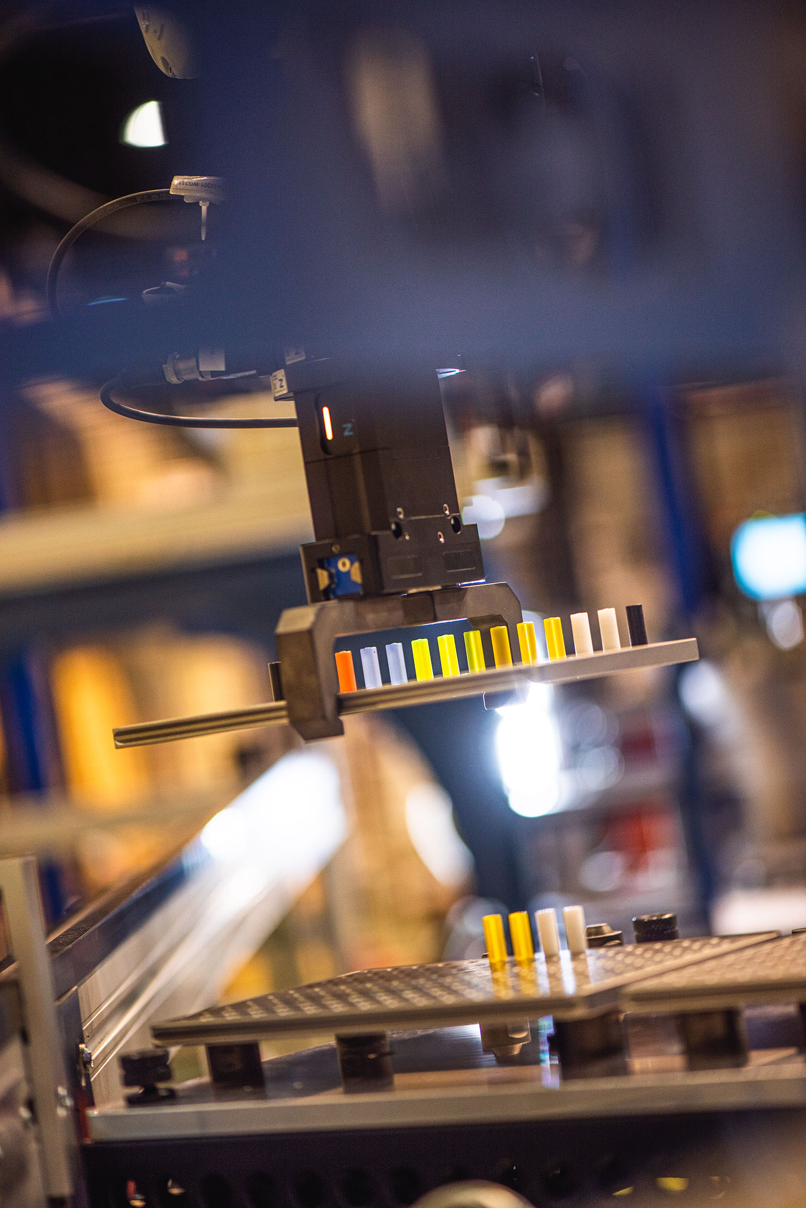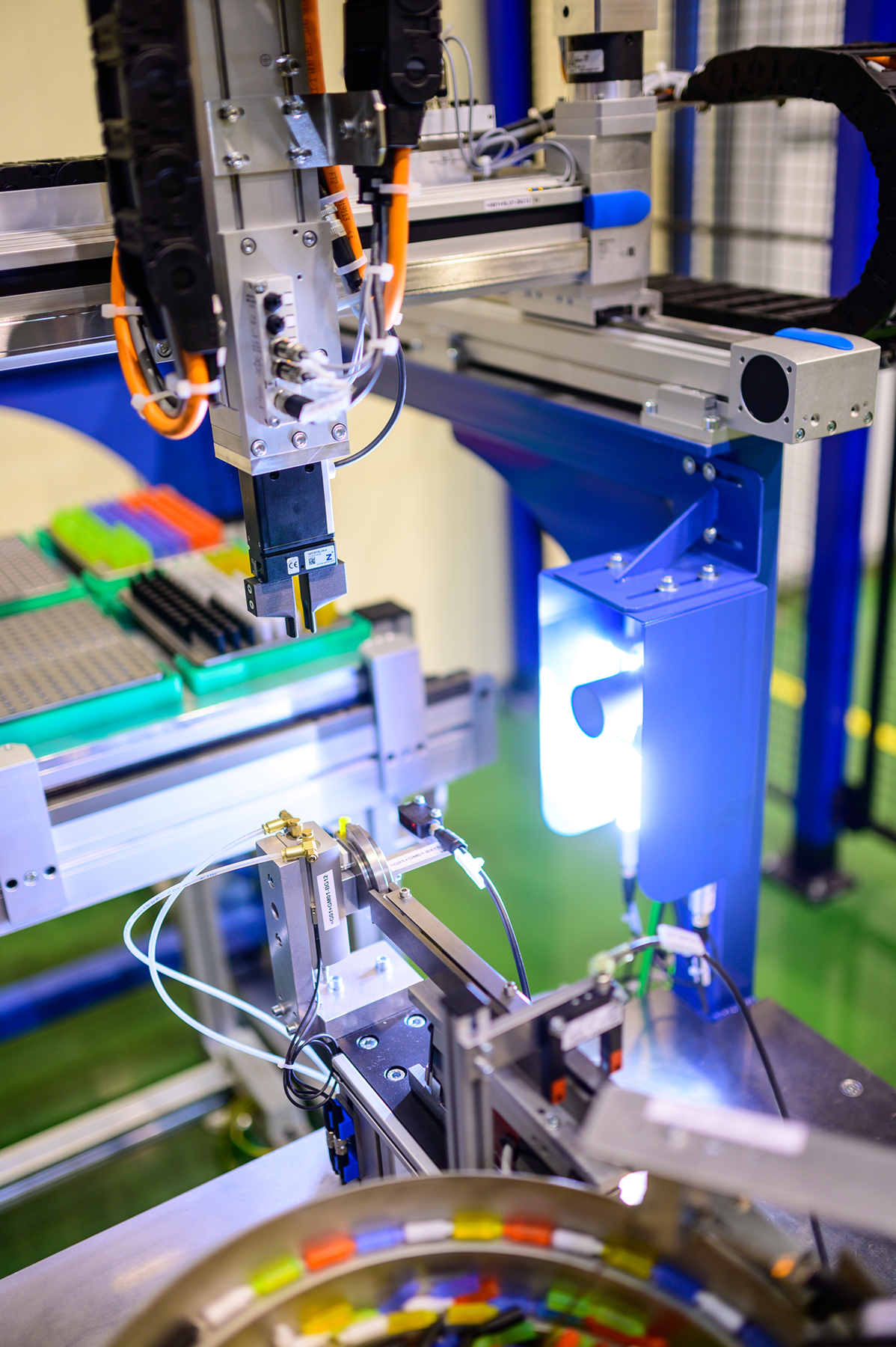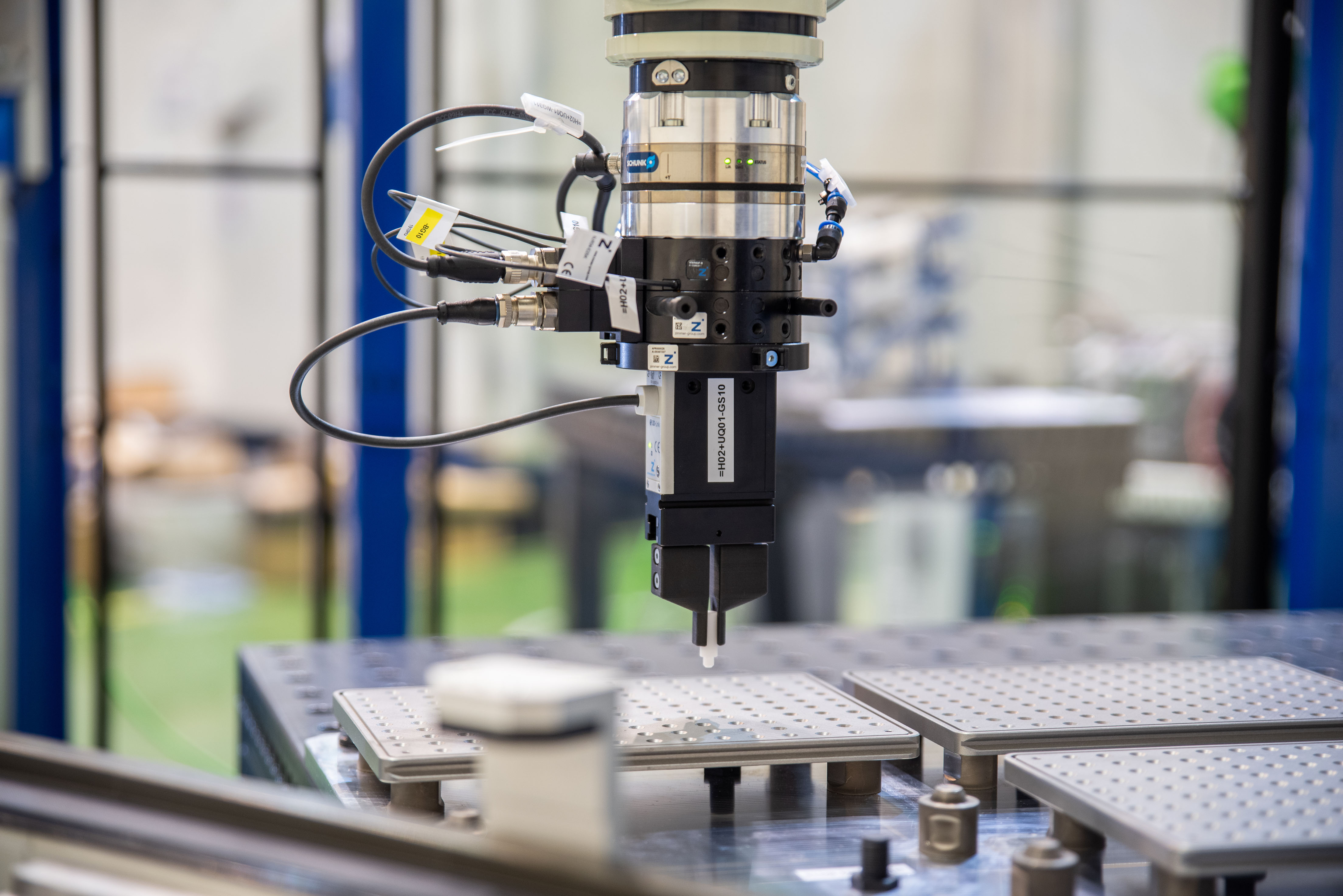 - Intelligente Bauteilerkennung: Einsatz moderner 2D- und 3D-Kameratechnik direkt an der Effektor-Einheit oder stationär, um Objekte lageunabhängig zu identifizieren und autonome Bahnkorrekturen durchzuführen.
